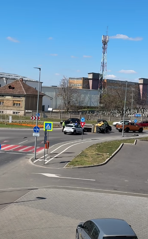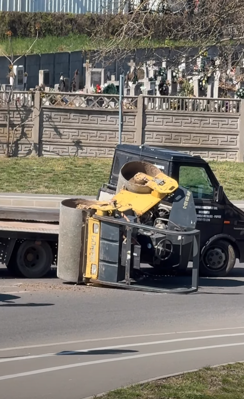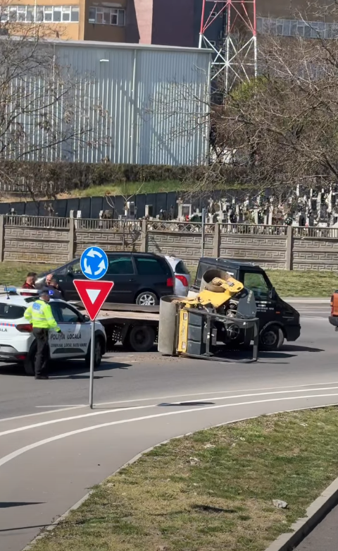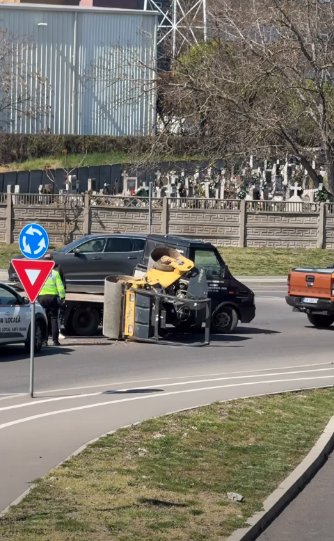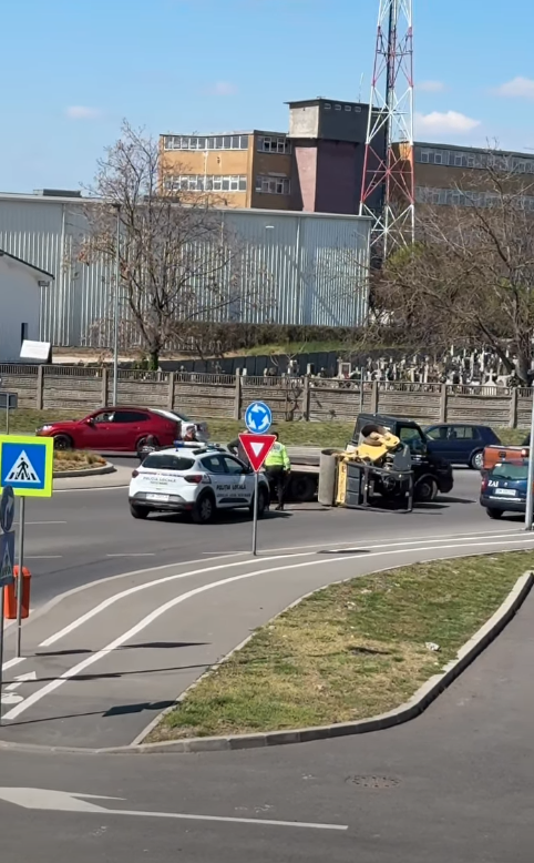 Utilajul a căzut în interiorul sensului giratoriu, iar șoferul care se afla la volanul vehiculului care efectua transportul a oprit imediat. Circulația a fost dată peste cap, la fața locului ajungând un echipaj al Poliției Locale care intervenit rapid pentru a asigura zona și a dirija traficul.