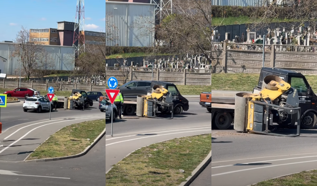 Utilajul a căzut în interiorul sensului giratoriu, iar șoferul care se afla la volanul vehiculului care efectua transportul a oprit imediat. Circulația a fost dată peste cap, la fața locului ajungând un echipaj al Poliției Locale care intervenit rapid pentru a asigura zona și a dirija traficul.