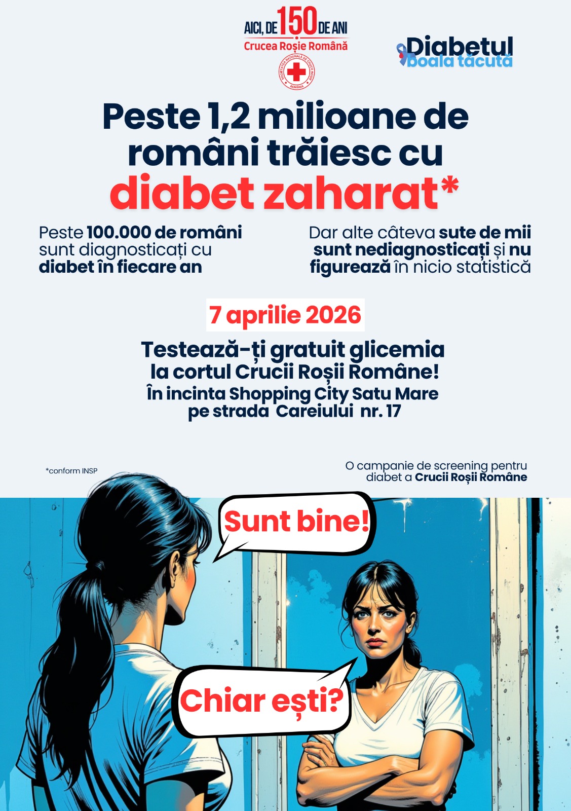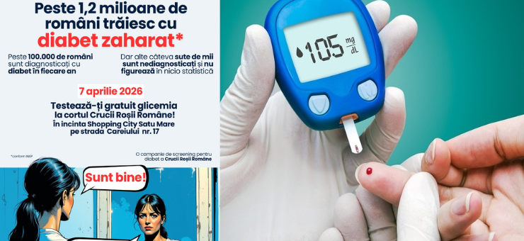 Cu prilejul Zilei Mondiale a Sănătății, marcată anual pe 7 aprilie, Crucea Roșie Română Filiala Satu Mare organizează un eveniment dedicat prevenției și monitorizării stării de sănătate a cetățenilor. Sub sloganul „Prevenția salvează vieți”, voluntarii filialei îi invită pe sătmăreni să participe la „Maratonul Sănătății”, unde vor putea beneficia de teste gratuite pentru determinarea nivelului glicemiei.