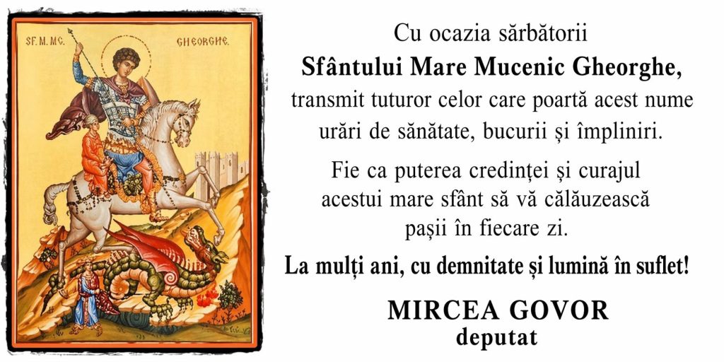 Deputatul Mircea Govor a transmis un mesaj cu ocazia sărbătorii Sfântului Mare Mucenic Gheorghe, adresând urări tuturor celor care își sărbătoresc onomastica și subliniind semnificația credinței și a curajului.